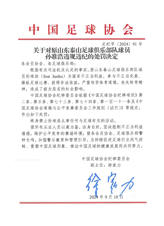 09月10日讯 足协官方公布处罚,孙准浩被终身禁足。