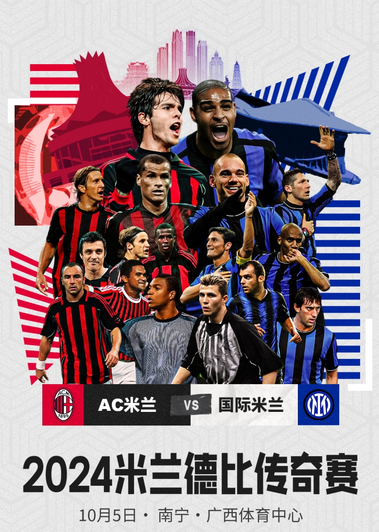 2024米兰德比传奇赛AC米兰vs国际米兰,将在2024年10月5日于南宁-广西体育中心盛大举行。作为官方媒体合作伙伴,将采访卡卡、里瓦尔多、西多夫、迪达、安布罗西尼等米兰传奇。
