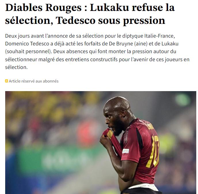多家比利时媒体报道,两名比利时老将卢卡库和德布劳内都不会参加10月份的欧国联比赛。据悉,德布劳内因为在对阵国米的比赛中与索默发生碰撞,腹股沟伤情复发,因此将缺席本期欧国联。而卢卡库则是因为“个人原因”拒绝参加,具体原因没有披露。因此,作为比利时队队长的他们二人大概率都会无缘对阵意大利和法国的比赛,不过从长久来看比利时足协并不着急,二人已经与主帅特德斯科进行了会谈,比利时足协有信心让他们参加2026年世界杯。