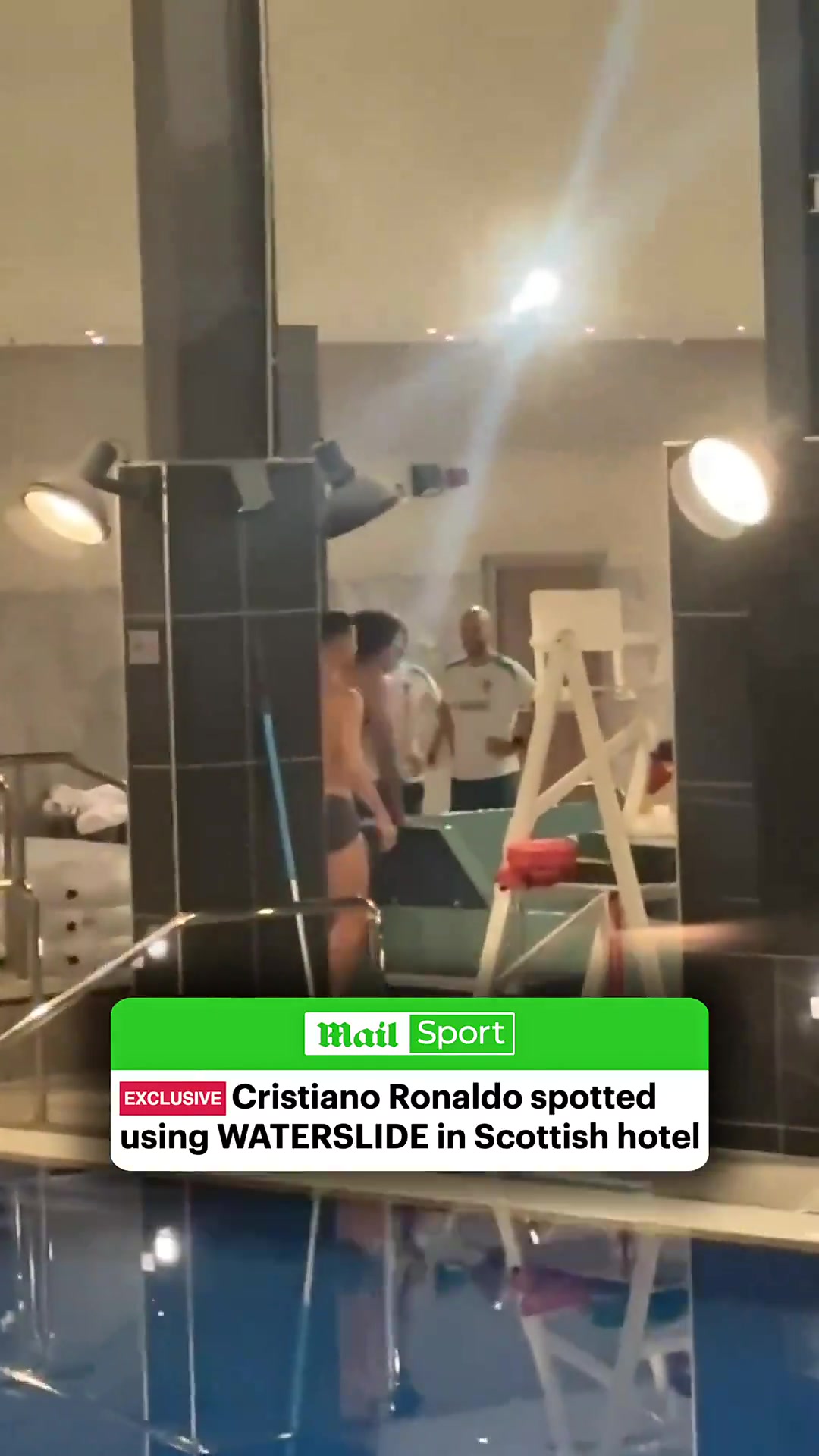 10月14日讯据《每日邮报》发布的视频显示,39岁的葡萄牙巨星C罗在苏格兰酒店泳池玩水上滑梯。