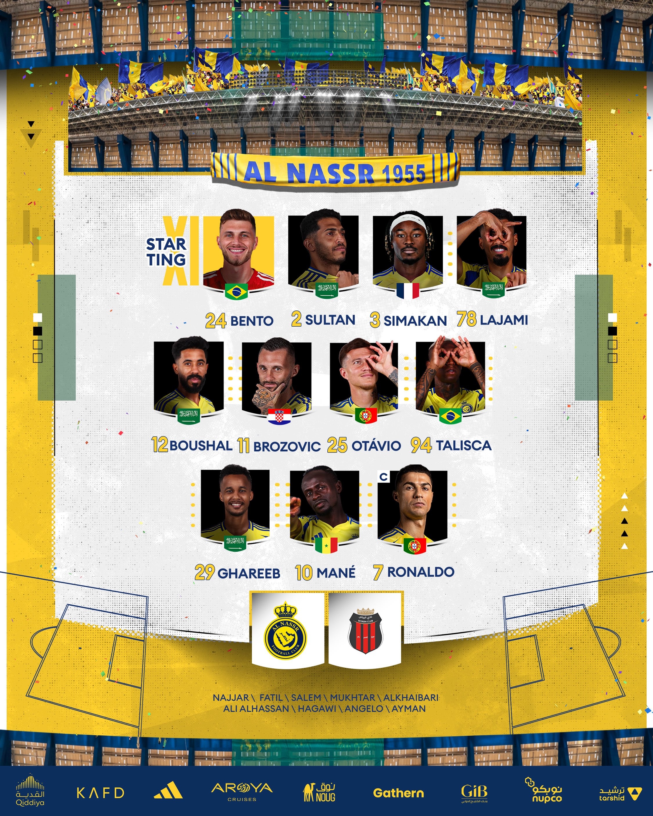 利雅得胜利首发:24-本托、12-纳瓦夫、3-西马坎、78-奥贾米、2-哈纳姆、11-布罗佐维奇、25-奥塔维奥、29-加里卜、94-塔利斯卡、10-马内、7-C罗