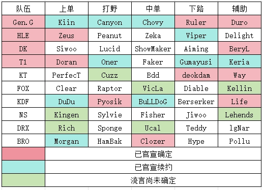 11月21日讯 英雄联盟冬季转会期已经开始进行,近日LCK赛区已经陆续官宣人员变动,截止目前LCK各队成员名单如下。