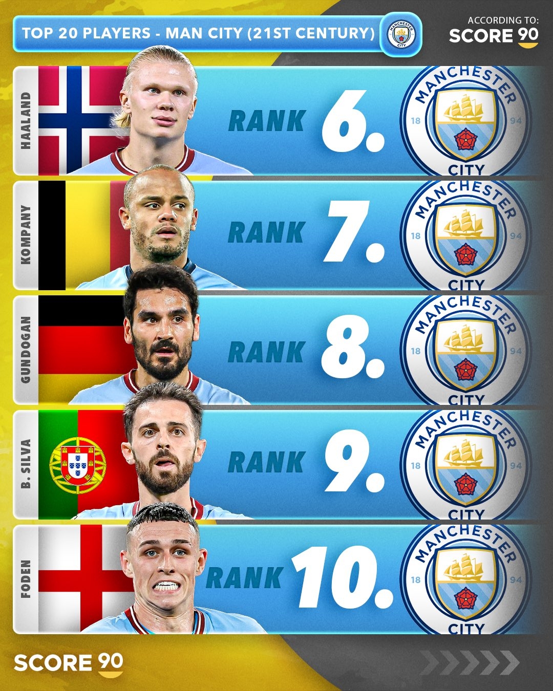 1、德布劳内(比利时)2、大卫-席尔瓦(西班牙)3、阿圭罗(阿根廷)4、罗德里(西班牙)5、亚亚-图雷(科特迪瓦)6、哈兰德(挪威)7、孔帕尼(比利时)8、京多安(德国)9、贝尔纳多-席尔瓦(葡萄牙)10、福登(英格兰)